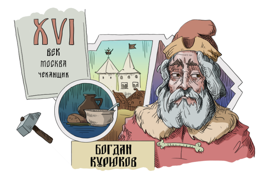 А вот этот персонаж уже успел подержать в руках копейку — перед нами денежный чеканщик первой половины XVI века Богдан Курюков.