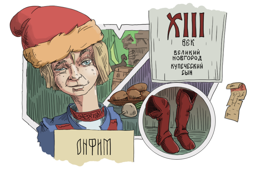 Середина XIII века, Великий Новгород. Перед нами мальчик Онфим. На вид совсем обычный, но по сути — непростой: он и не раб, и не боярский сын, но все же из состоятельной семьи. Здесь, в Новгороде, он известен мало, зато о нем слышали даже в наше время. Сквозь века до нас дошли его берестяные грамоты с посланиями и детскими рисунками.