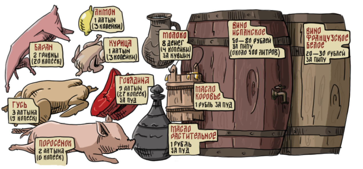 После хорошей работы полагается хороший обед. Готовим дома, а закупаемся впрок. Часть говяжьей туши стоит 4 денги-московки — значится, 2 копейки-новгородки. Баранья туша — 2 алтына, то есть 6 копеек, ведро молока — 6 денег, а пуд меда — 100 денег. В сухом остатке сытно и вкусно поесть москвичу за один раз можно и на 2-3 денги. Хлеб будет, мясо будет, и даже ложка меду для сласти — и все это квасом или сбитнем запьется. Ну, это если работать не ленишься.