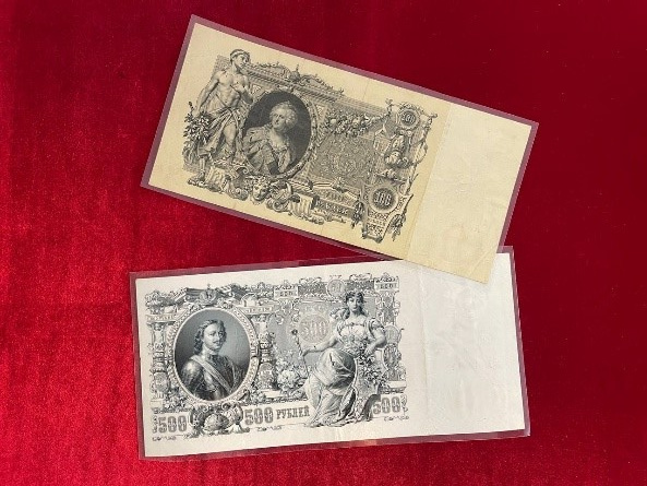 Государственные кредитные билеты 100 и 500 рублей образца 1910 и 1912 годов – самые большие по размеру банкноты в истории России. В народе они получили прозвища «катенька» и «петенька» – по портретам Екатерины II и Петра I.